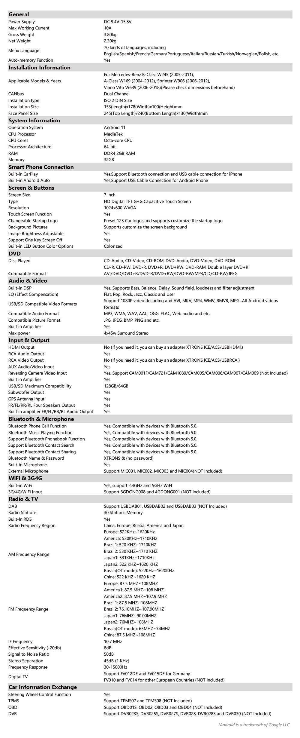 Android 12 Octa Core 2GB DDR4 RAM + 32GB ROM 7” Car DVD Multimedia Player GPS Navigation System with Dual UI Automotive-grade Hardware Built-in CarAutoPlay & Android Auto & DSP Radio with RDS Coaxial Audio Output Custom Fit for Mercedes-Benz A-Class/B-Class/Sprinter/Viano & Vito