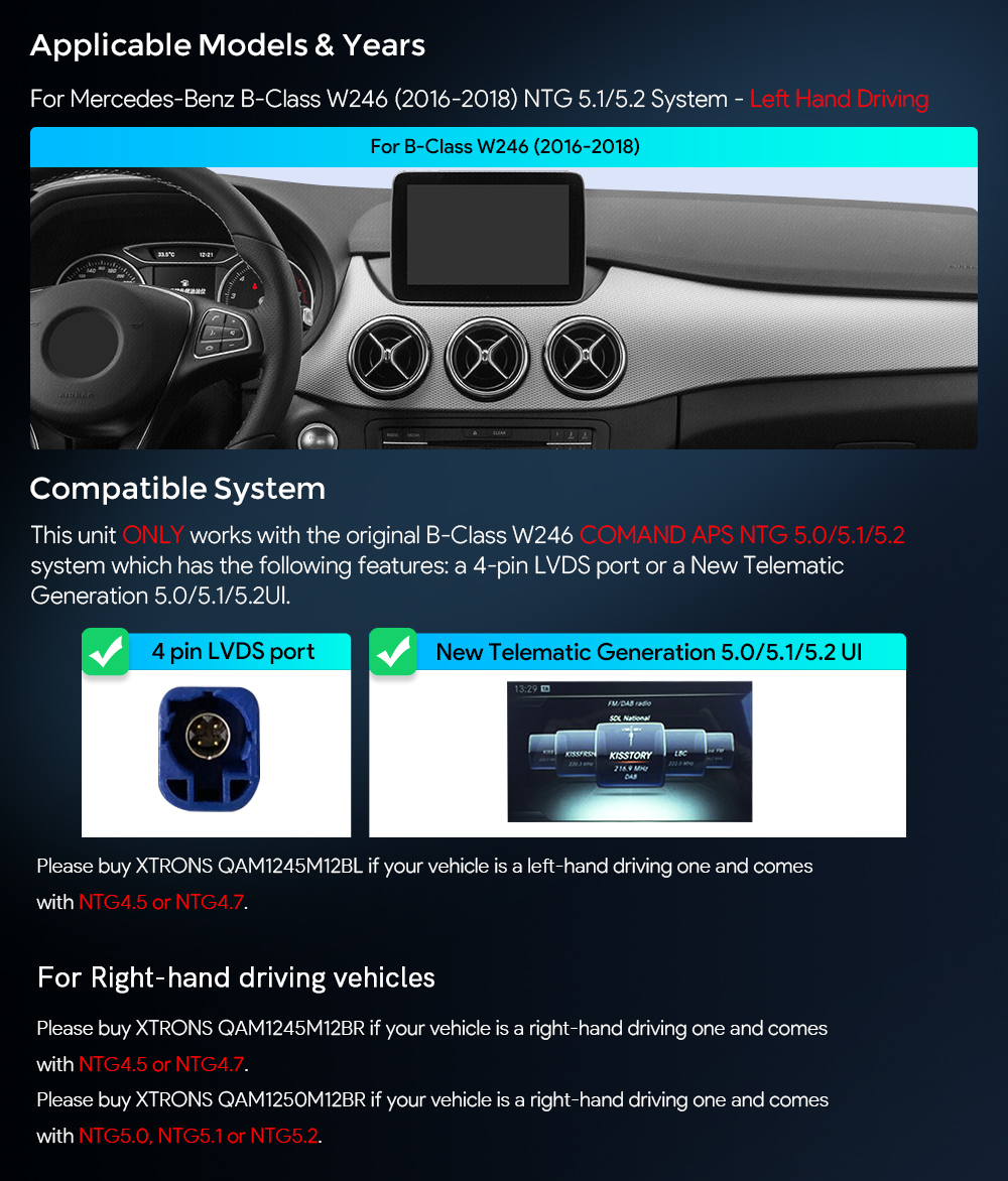 10.25″ Fully-laminated 1920×720 HD IPS Screen Android 13 Car Stereo with 8GB DDR4 RAM 128GB Solid State ROM Integrated Global 4G LTE Solution Wireless CarAutoPlay Android Auto Built-in DSP 2K Video Playback Support AHD Reversing Camera for Mercedes-Benz B-Class W246 Left Driving Vehicles with NTG5.1 or NTG5.2 System