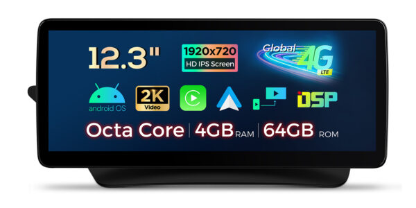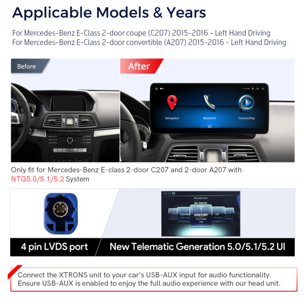 12.3″ Fully-laminated 1920×720 HD IPS Screen Android 13 Car Stereo with New Concept Design 4GB DDR4 RAM 64GB EMMC ROM Integrated Global 4G LTE Solution Wireless CarAutoPlay Android Auto Built-in DSP Support 2K Video Playback Screen Mirroring Support AHD Reversing Camera Retain Original COMAND System for Mercedes-Benz E-Class 2-Door Coupe with NTG 5.0/5.1/5.2 System Left Hand Drive Vehicles